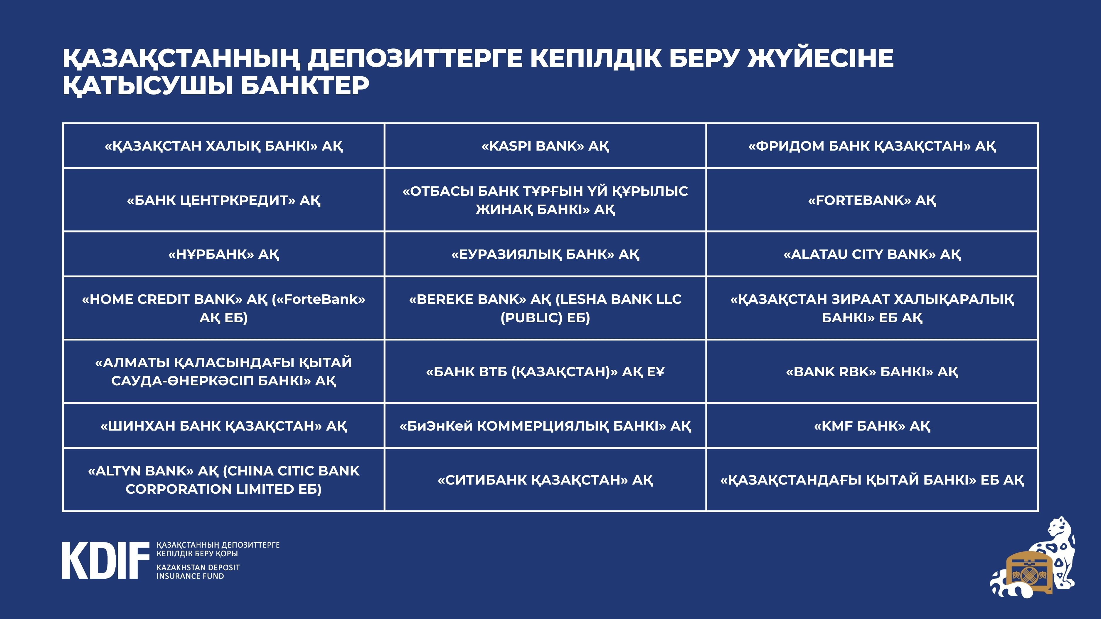 Қазақстанда халықтан депозиттер қабылдайтын және жеке тұлғаларға шоттар ашатын банктердің барлығы депозиттерге кепілдік беру жүйесіне қатысуға міндетті.